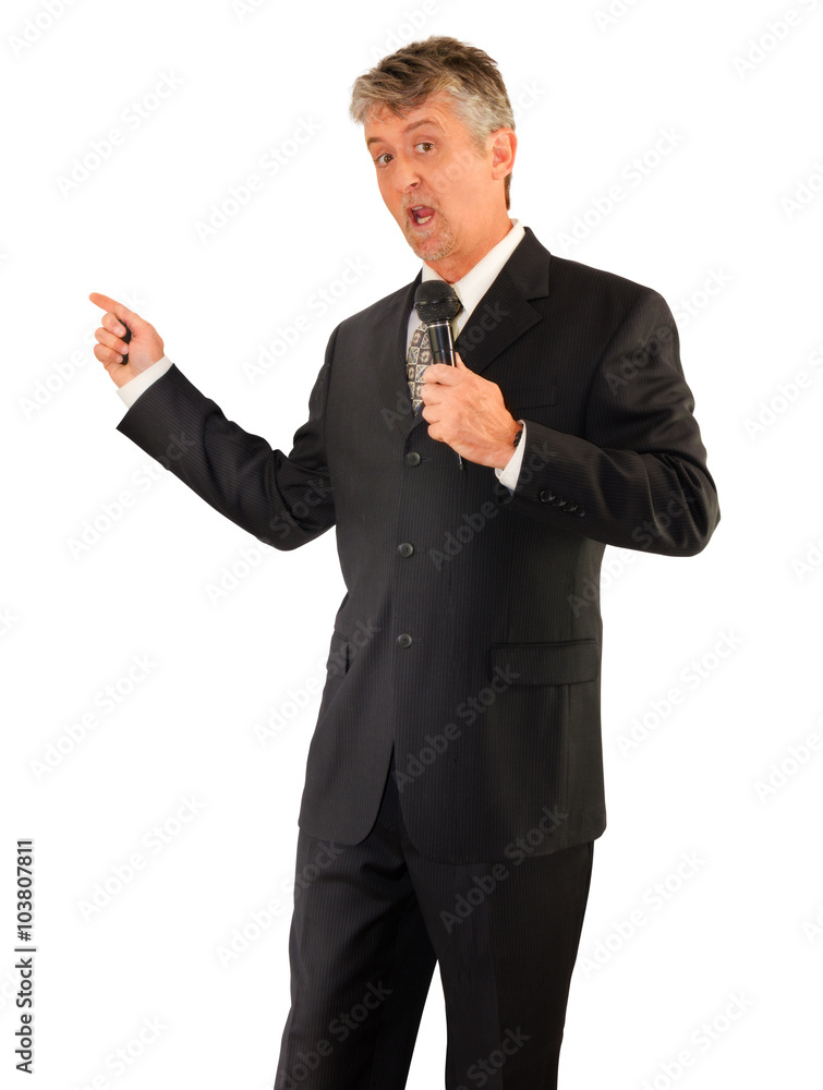 Television TV news caster reporter reporting with a microphone isolated on a white background