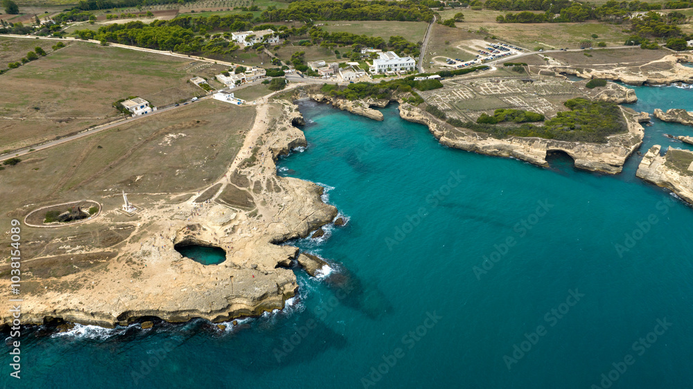 Aerial view of the Grotta della Poesia (Poetry Cave) and the archaeological area of Roca Vecchia in the province of Lecce, Salento, Puglia, Italy.