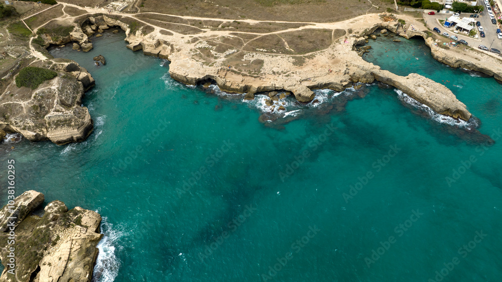 Aerial view of a rocky coast overlooking the crystal blue sea.