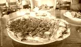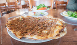 Delicious Turkish Lahmacun served with fresh greens and lemon in a traditional restaurant setting