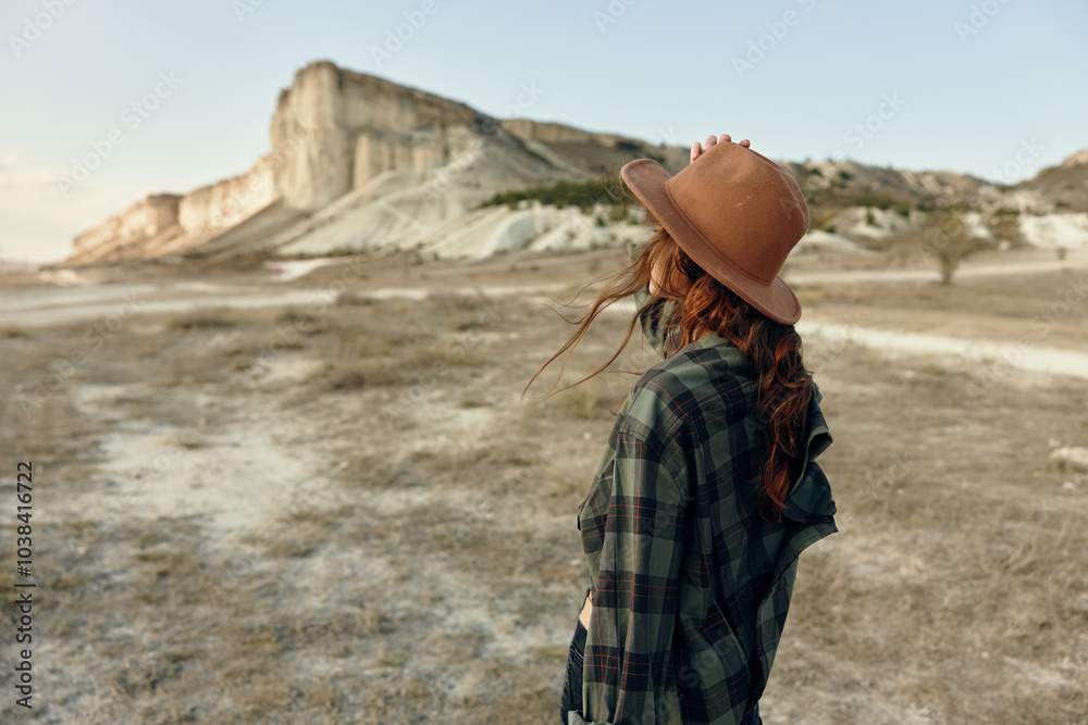 Adventure awaits woman in plaid shirt and hat gazes at majestic mountain range