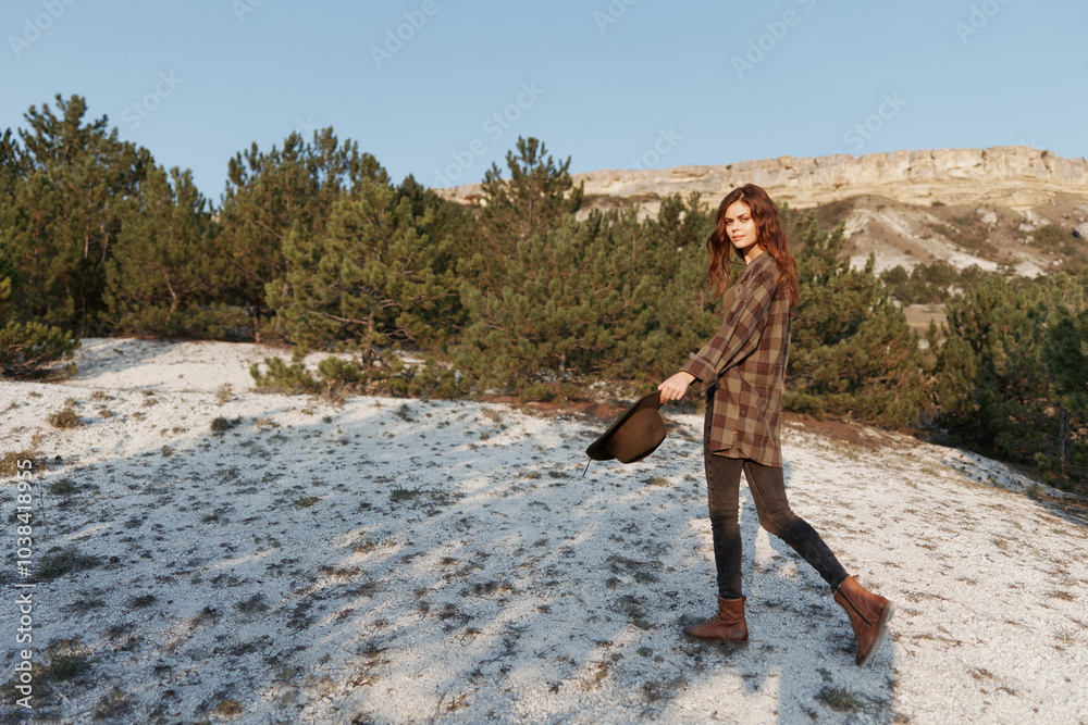 Winter stroll woman in plaid shirt walking through snow with hat on