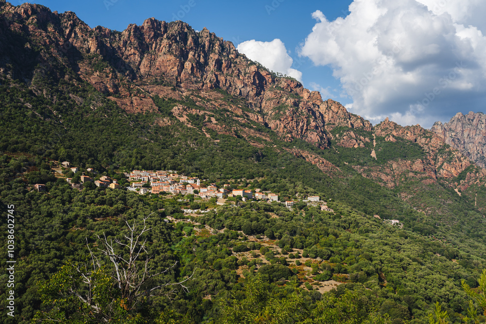 cenic view of Ota village in Corsica surrounded by high granite mountains in background