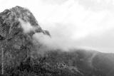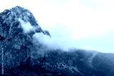 Mountain peak shrouded in dense fog with dramatic rock formations and soft clouds rolling through. Concept of natural beauty, remote wilderness, and peaceful high-altitude scenery. High quality photo