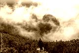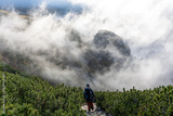 Hiker carrying a backpack walks along a misty mountain trail, surrounded by clouds drifting over the rugged peaks, with a serene and adventurous atmosphere. High quality photo