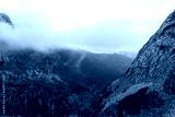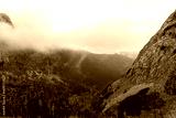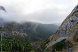 Serene mountain landscape with mist covering pine forests and rocky cliffs on a cloudy day. Concept of nature is beauty, remote wilderness, and peaceful outdoor adventure. High quality photo