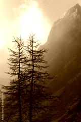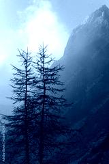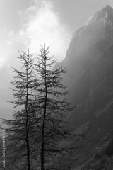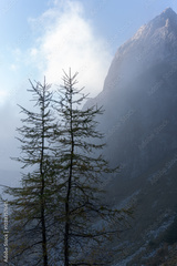 Two tall trees standing against foggy mountain landscape with rocky cliffs and misty clouds on a serene morning. Concept of tranquility, nature's beauty, and peaceful wilderness. High quality photo