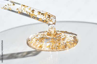 Luxurious translucent serum with gold flakes in dropper for premium skincare and beauty treatments