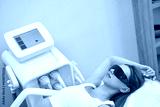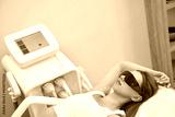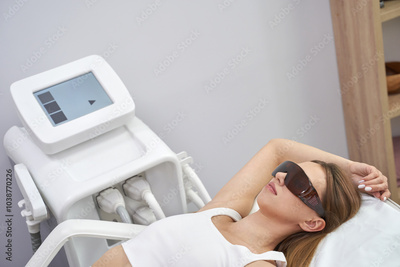 Woman undergoing laser hair removal treatment in modern clinic with protective goggles and advanced equipment.