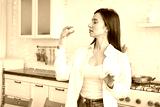 Woman enjoying macarons in modern kitchen setting with soft ambient lighting.