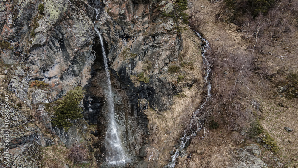 Beautiful waterfall in the mountains. A mountain river flows down. Beautiful nature. Stones and water.