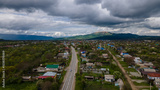 Small village near the road. Clouds in the sky. Drone view. Small houses.