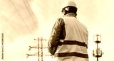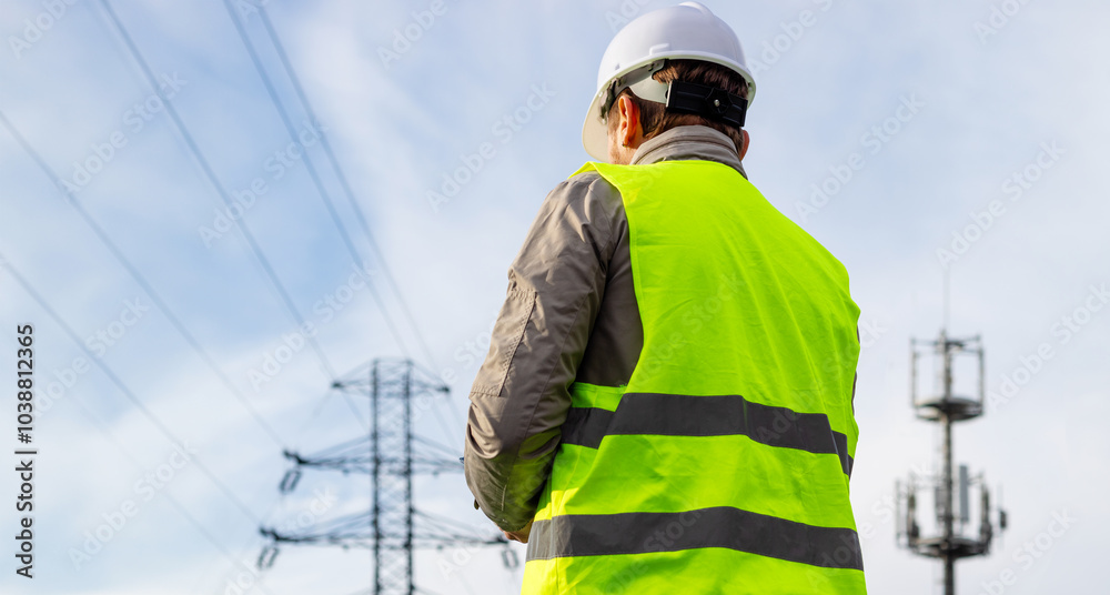 Male engineer, seen from the back, employee of a telecommunications company, stands in front of a high voltage power line and a cell phone tower.