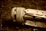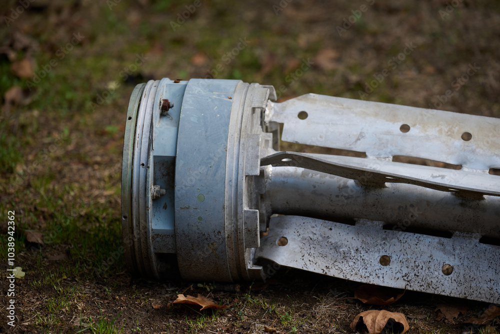The tail section of a 220 mm rocket for the Uragan rocket fire system on a city flowerbed in Mykolaiv