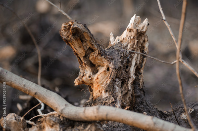 Nature's Resilience: A Close-Up of a Weathered Tree Stump Amidst Bare Branches
