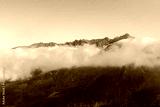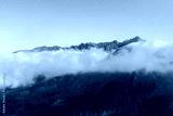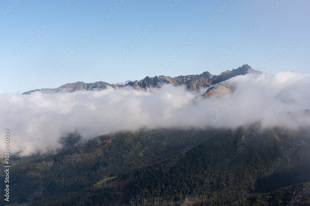 Stunning mountain landscape shrouded in clouds under clear blue sky on bright sunny day. Concept of nature's beauty, serene outdoor scenery, and the allure of mountain exploration. High quality photo