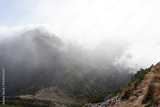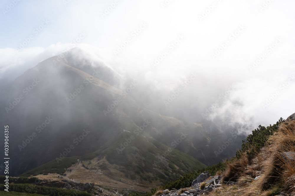 Majestic mountain peaks partially covered by fog with sunlight breaking through the clouds. Concept of breathtaking scenery, outdoor adventure, and tranquil nature. High quality photo