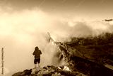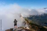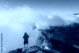 Adventurer on a foggy mountain trail, standing at the edge of a rocky cliff, immersed in the mist and watching the towering peak. Concept of outdoor adventure, solitude, and nature's beauty.
