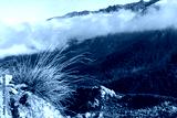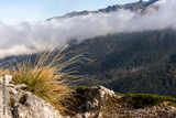 Golden blades of grass in the foreground with a breathtaking view of the mountain ridge in the background, surrounded by floating clouds and mist on a sunny autumn morning. High quality photo