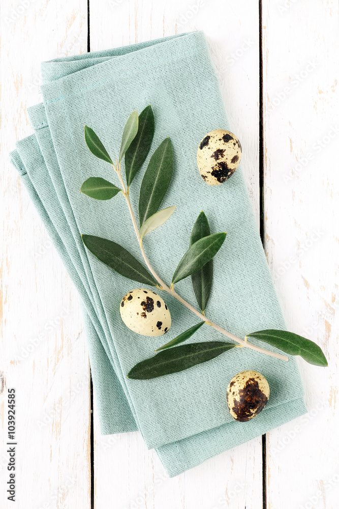 Easter celebration concept - Olive branch and quail eggs on a table napkin against white wooden background. Overhead view