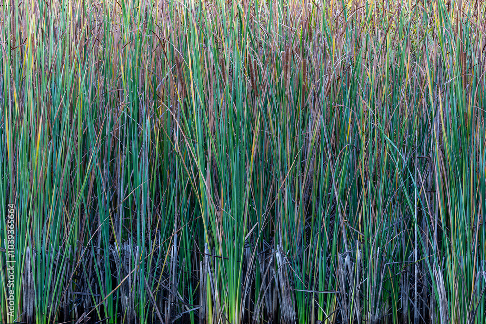 Typha angustifolia. Cattails or narrow-leaved cattails in wetland. Lesser bulrush.