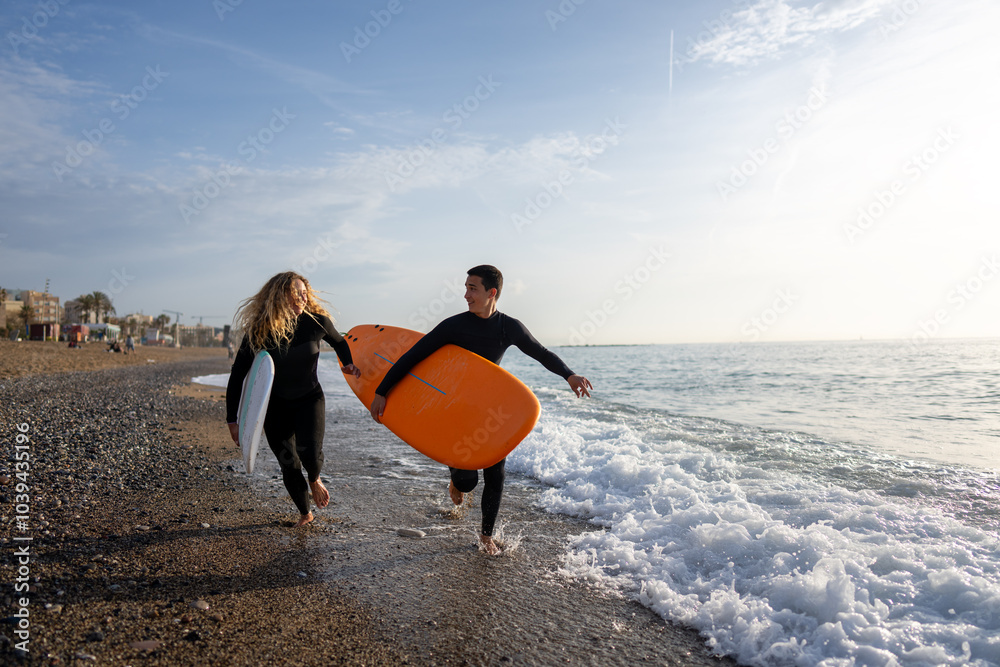 Two friends surfers going for surfing in the sea. Carrying surfboards running in to the sea surfing
