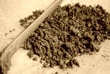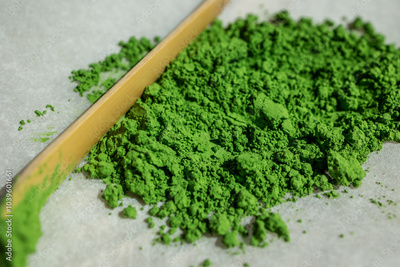 Vibrant green matcha tea powder arranged with a bamboo scoop