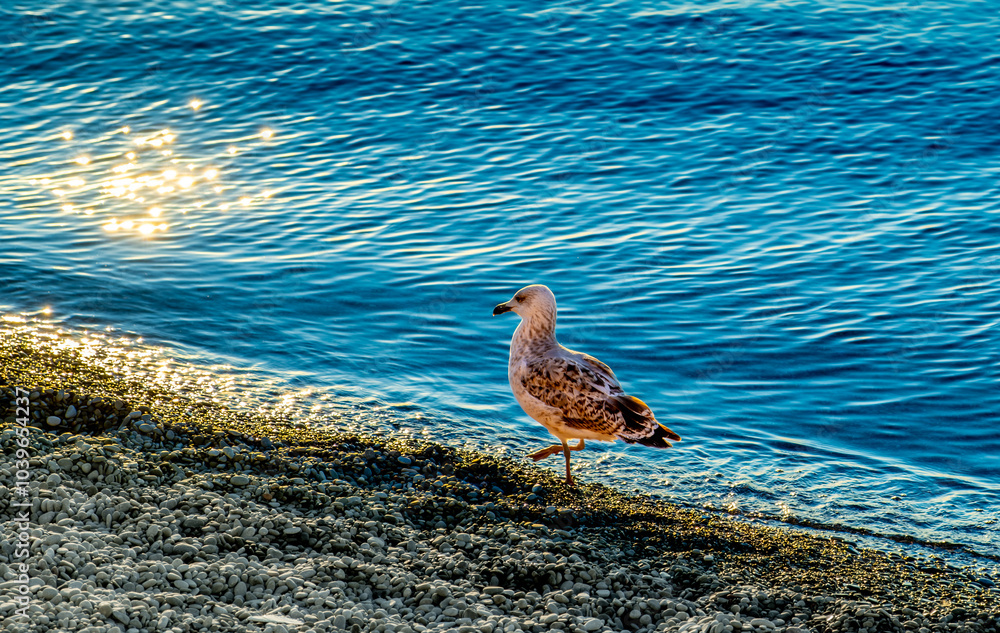 A seagull walks along the sand of the beach near the sea on a summer day.