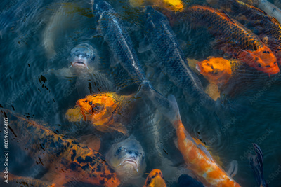 Carp fish of different colors in a pond on the surface.