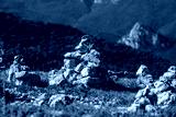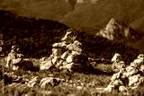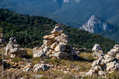 A pyramid of stones on the top of the mountain left by tourists.
