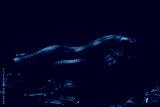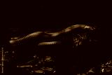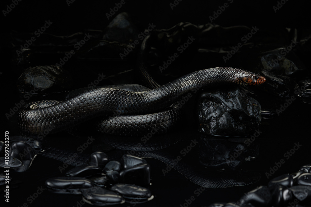 A black snake is resting on a dark reflective surface, blending seamlessly with the background