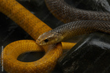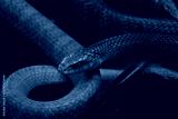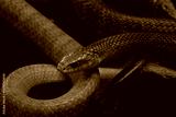 A snake is curled up on rocks, its body forming a tight spiral. The snake position suggests it is at ease, blending perfectly with the dark, rugged terrain.