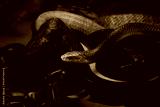 A snake is coiled on black rocks, its body blending with the dark surroundings.