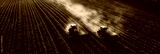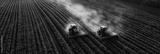 Two red tractors plowing and cultivating rows of green agricultural fields in a scenic rural landscape. Aerial overhead view of modern farming equipment working in open countryside.