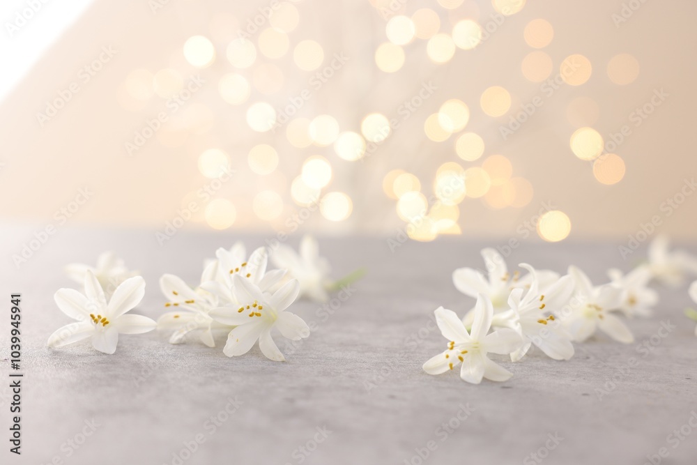 Beautiful jasmine flowers on grey surface against beige background with blurred lights, closeup