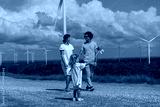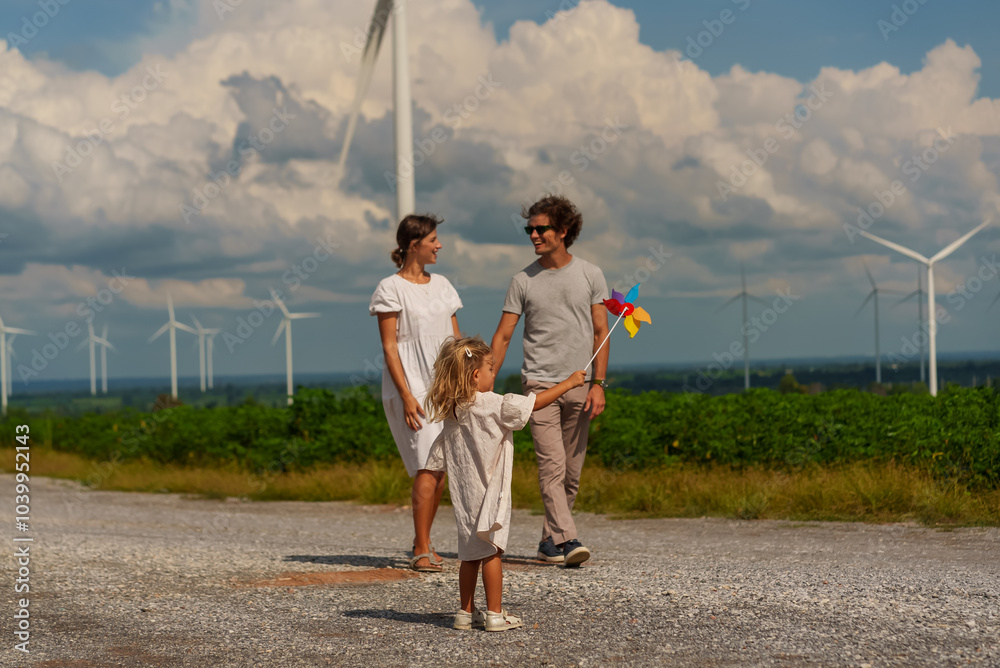 Family and travel, behind is a windmill, renewable energy source, environmental sustainability concept