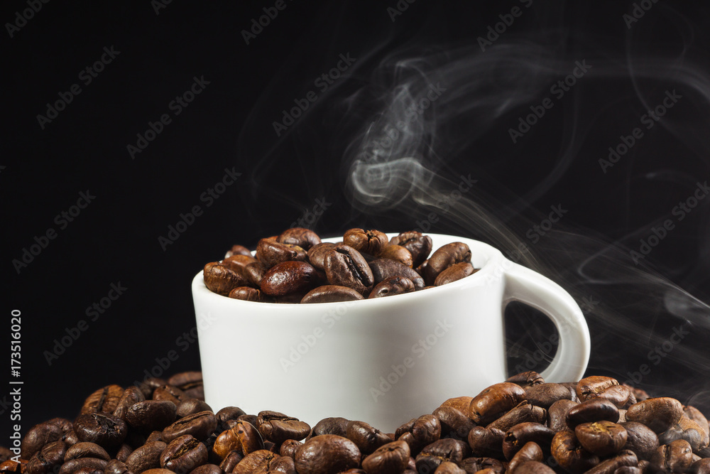 A white cup atop a bed of coffee beans, capturing the essence of fresh coffee and convenience.