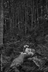 A Nova Scotia Duck Tolling Retriever lies on a log in the forest, looking relaxed. The dog is surrounded by the serene wilderness.