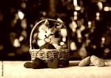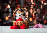 card with a cute fluffy kitten peeking out of a basket with a red ball of yarn on a shiny holiday background