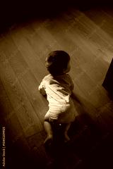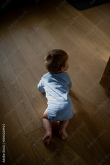 Small toddler baby boy in a light blue onesie walking on wooden floor looking around and learning to crawl before learning how to walk