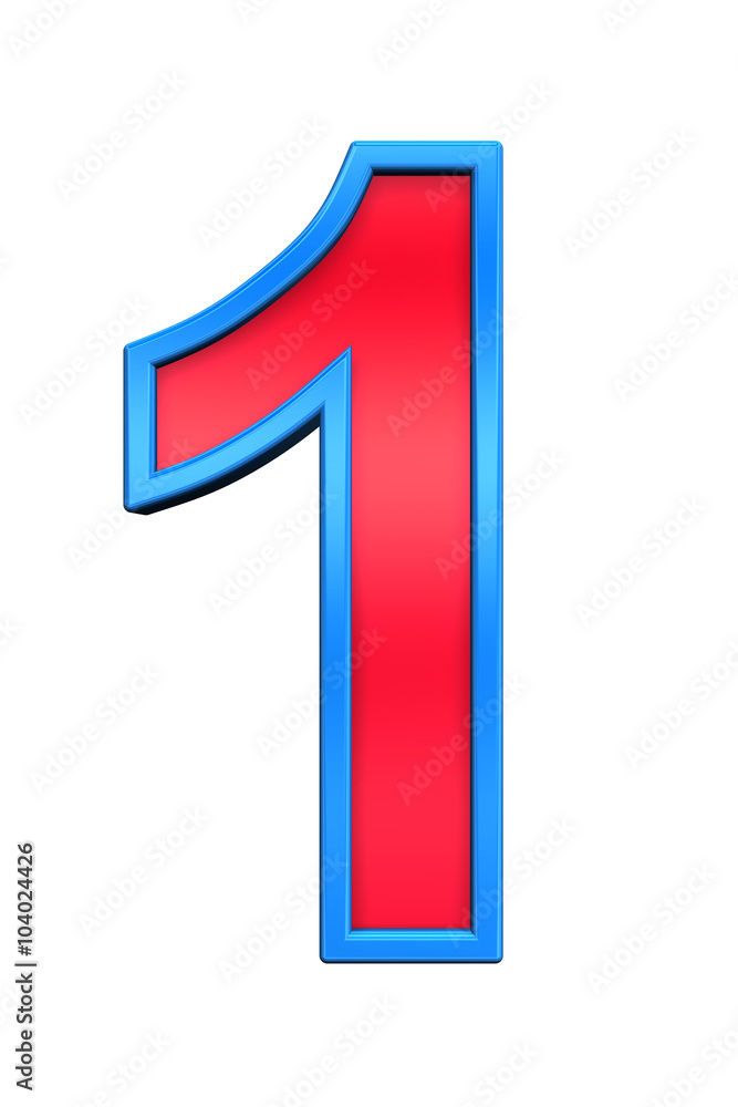 One digit from red glass with blue frame alphabet set, isolated on white. Computer generated 3D photo rendering.