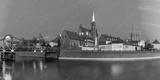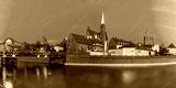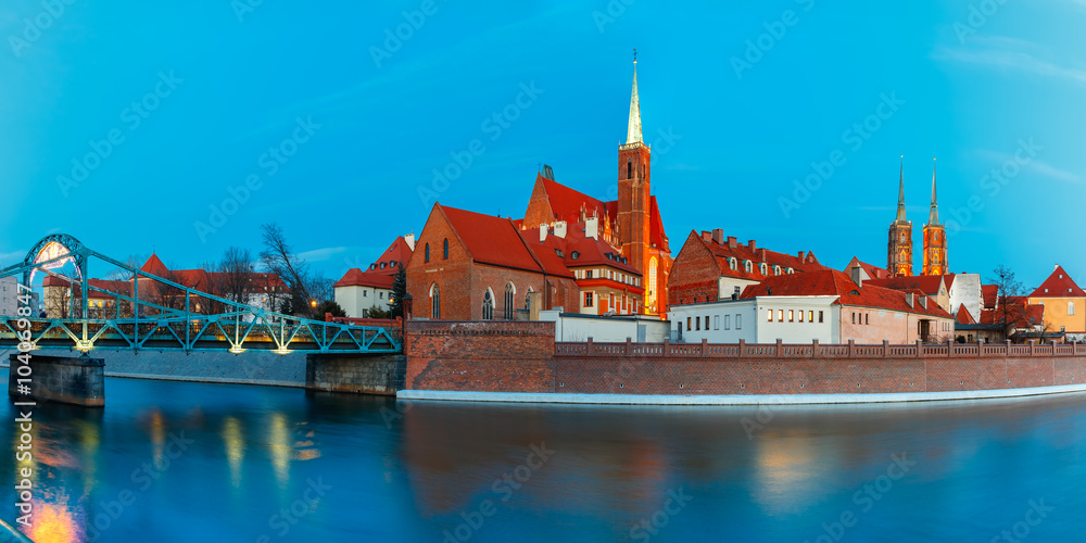 Panorama of Tumski Bridge and Island with Cathedral of St. John and church of the Holy Cross and St. Bartholomew at night in Wroclaw, Poland