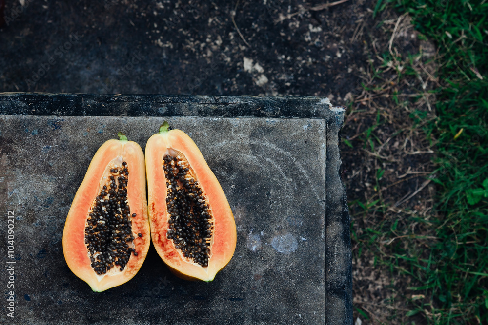 Cut up papaya fruit in the garden