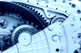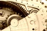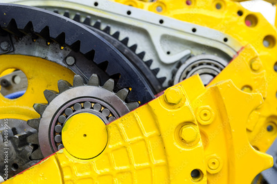 Drive gear and bearings, cross section of bulldozer sprocket internal mechanism, large construction machine with bolts and yellow paint coating, heavy industry, detail