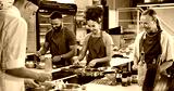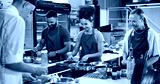 Cooking, course and chef in kitchen with group for meal preparation, teaching gourmet recipe or learning skills. Culinary class, people and mentor with lesson on food education and cuisine knowledge