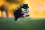 miniature spitz puppy running on grass in summer