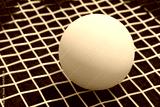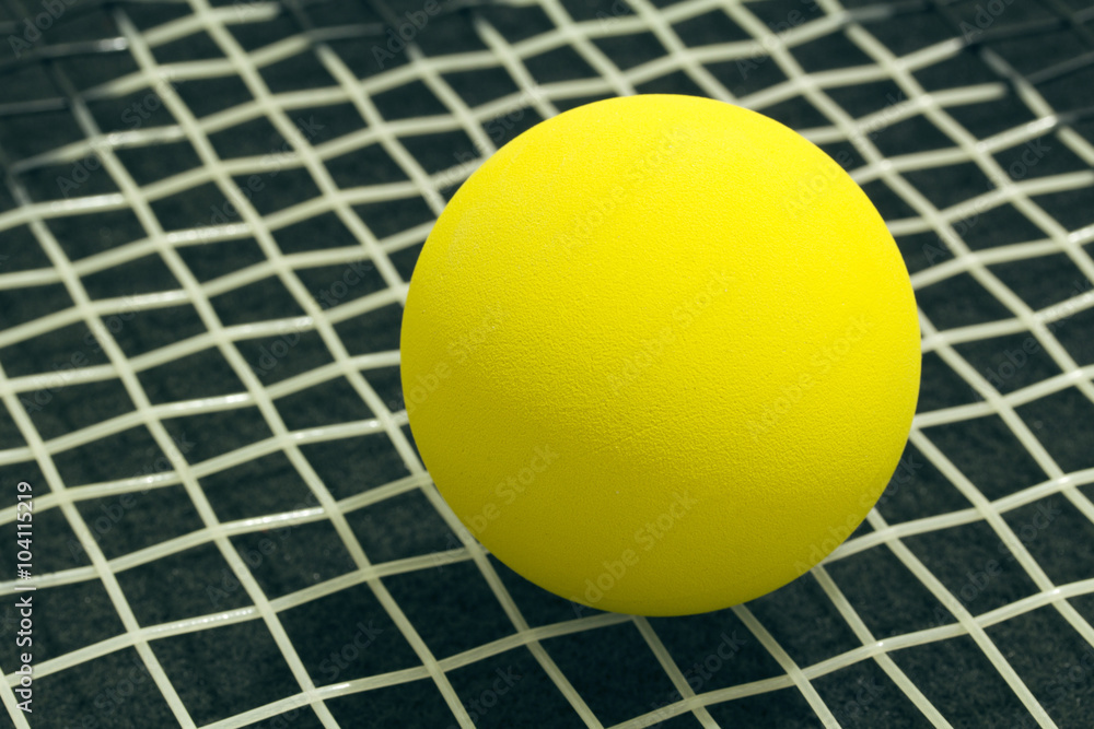 Racquetball on racket strings. Yellow frontenis ball laying on r