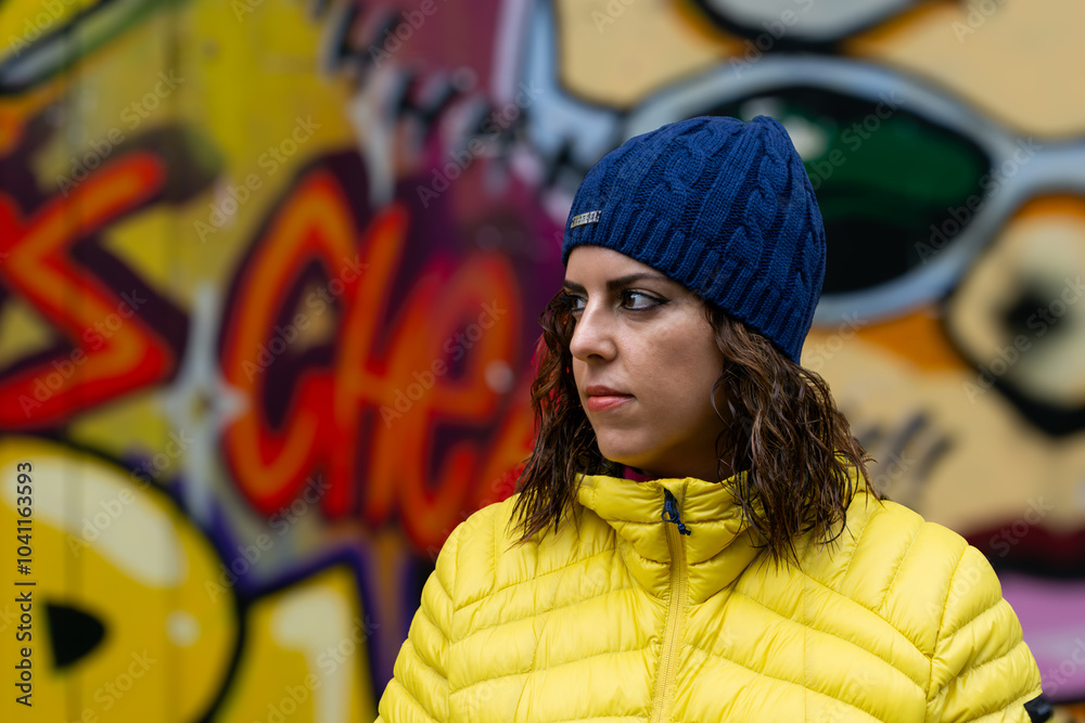 A brunette woman, in her 30s, wearing a yellow puffer jacket and a blue wool hat, looking serious to the side with a wall with graffiti behind her