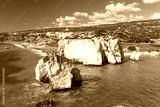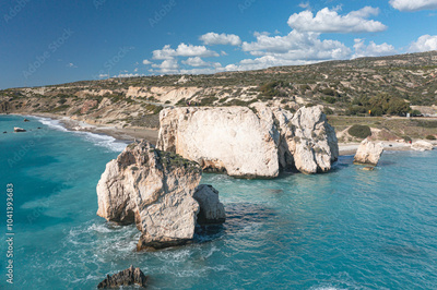 Turquoise water surrounding Aphrodite's rock on beautiful sunny day in Cyprus