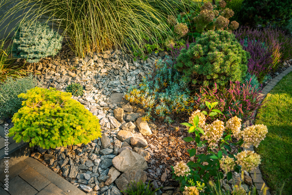 Lush Garden Landscape With Rocks, Shrubs, and Colorful Flowers in Early Evening Sunlight